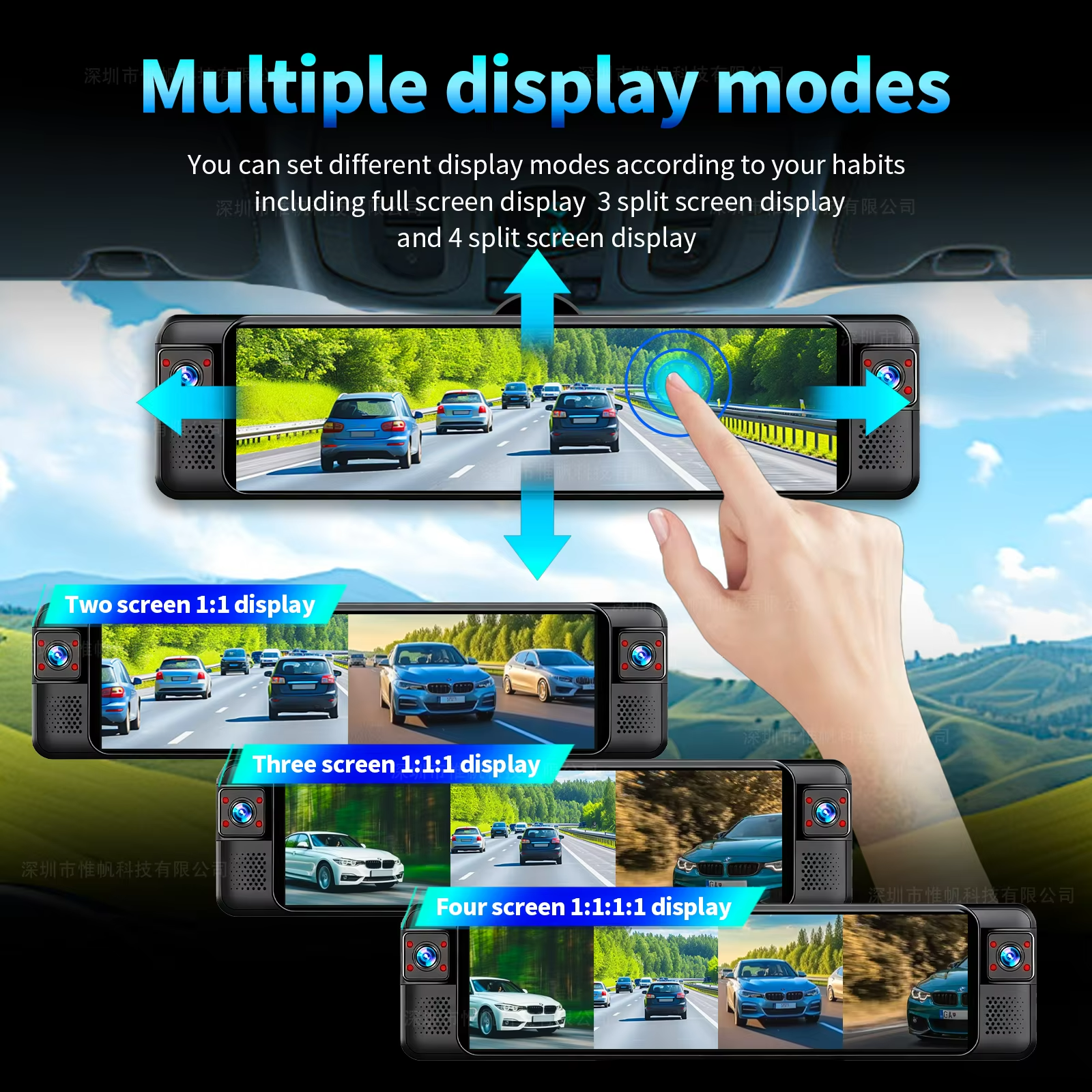 Choose from full screen or split-screen display modes to view multiple camera angles at once, giving you better control and visibility while driving.